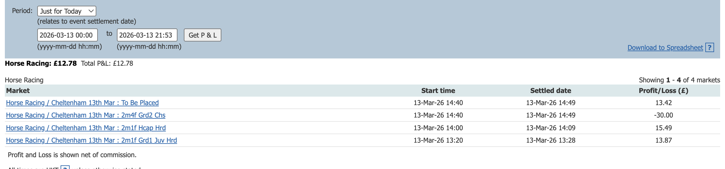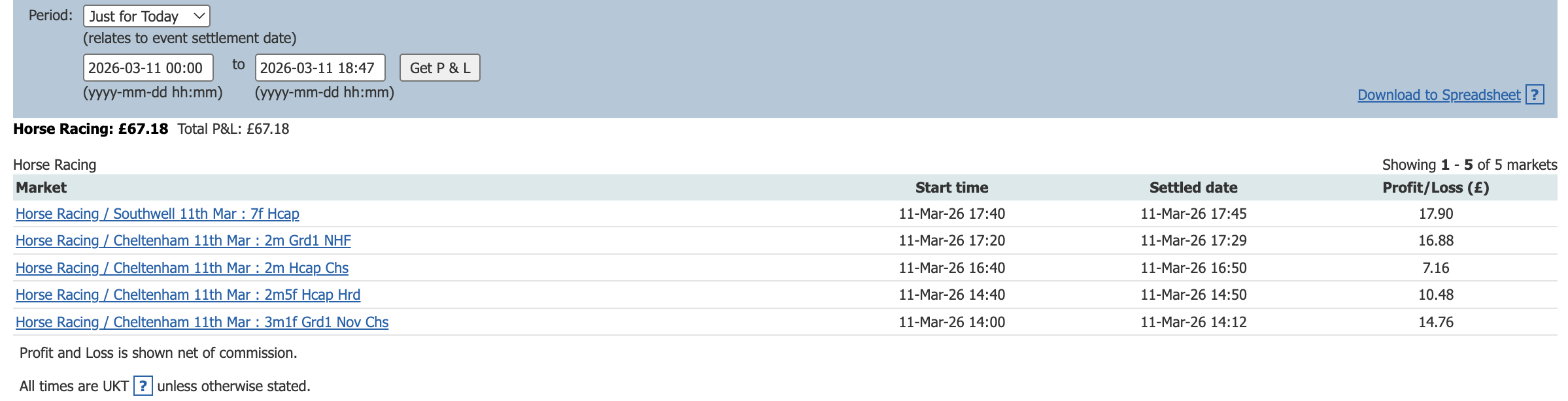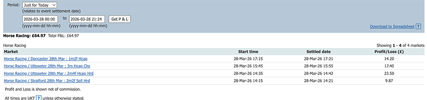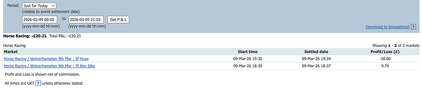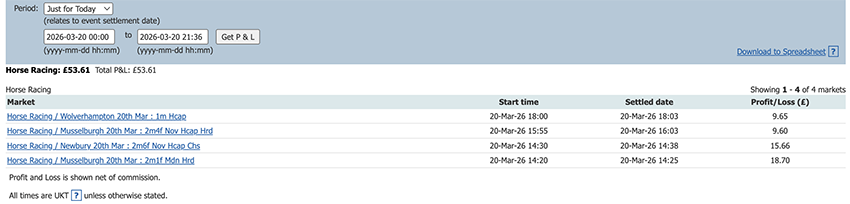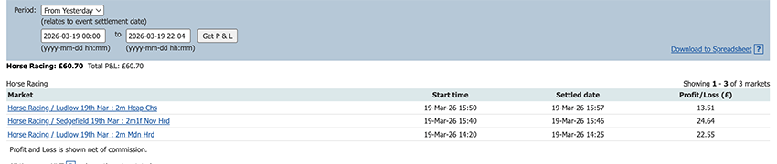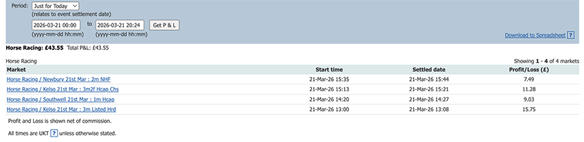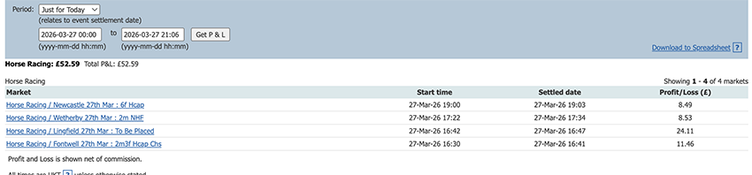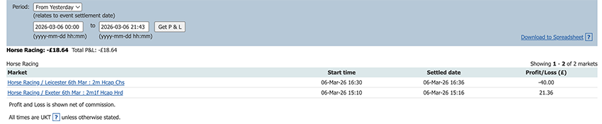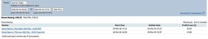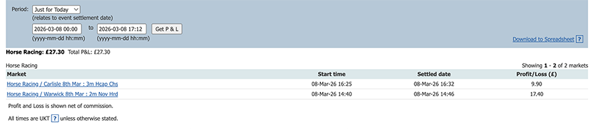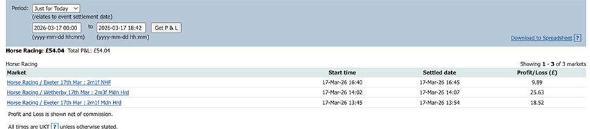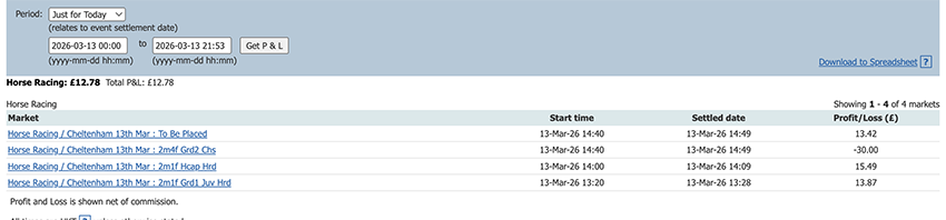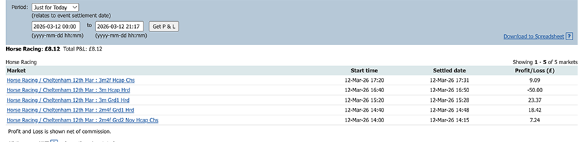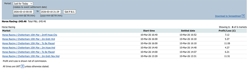 Start of the Cheltenham Festival so a bit more action today and a perfect 6/6, some only small wins due to the odds at festival time but it all adds up.
