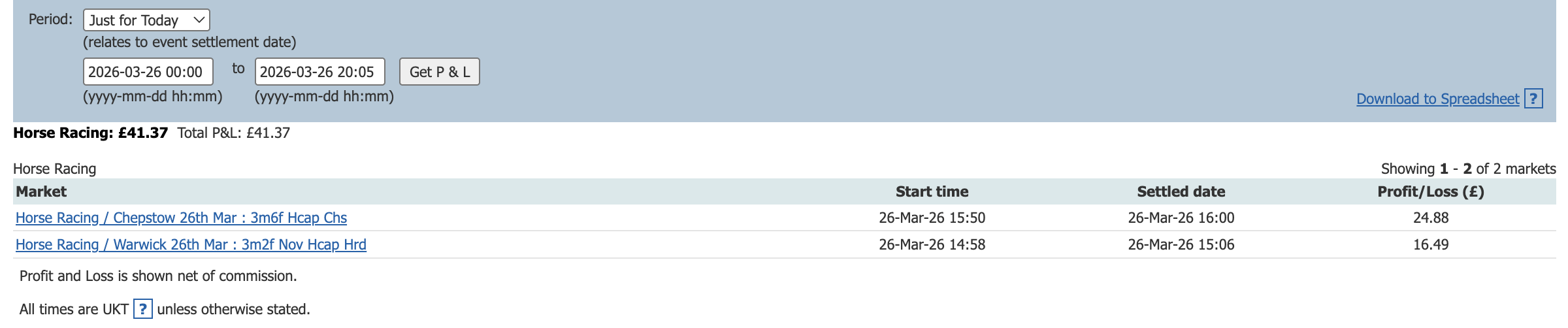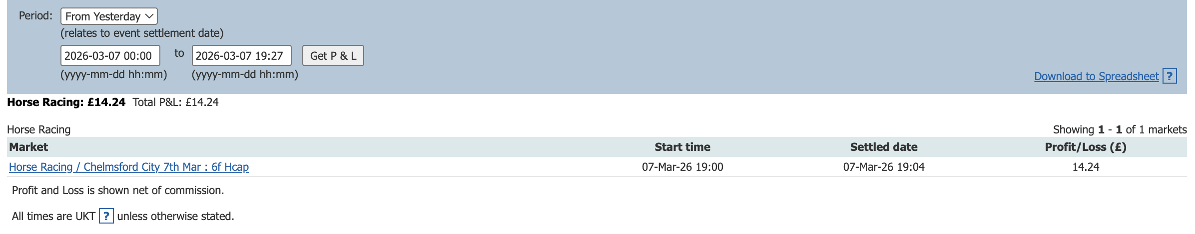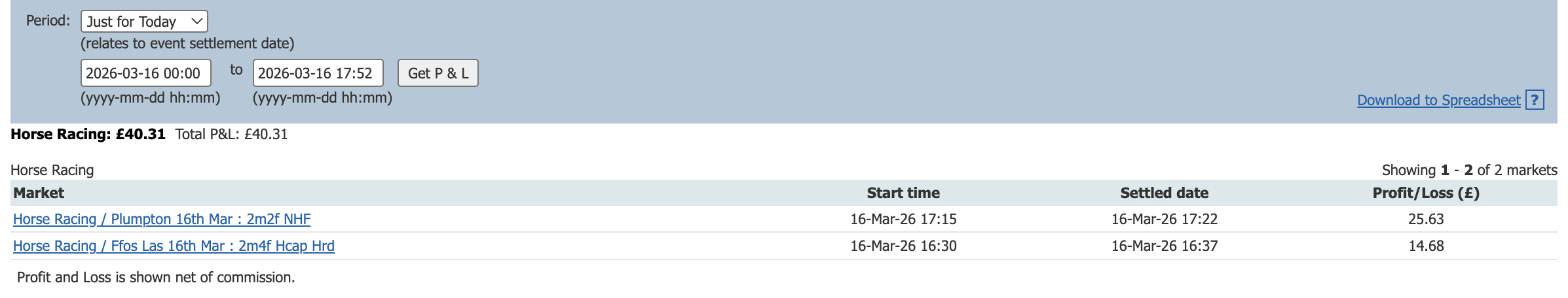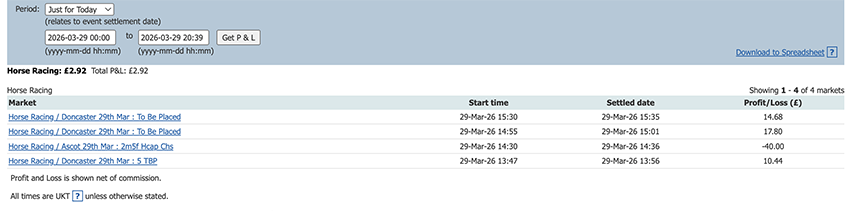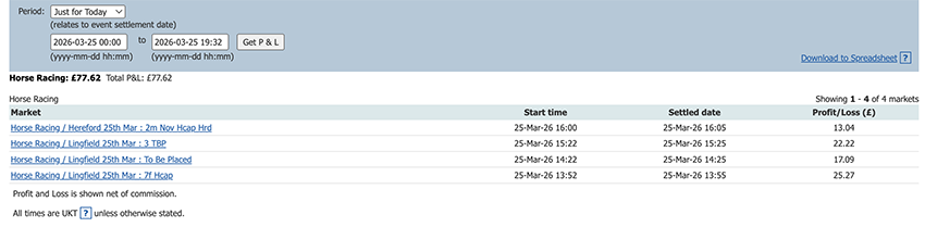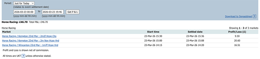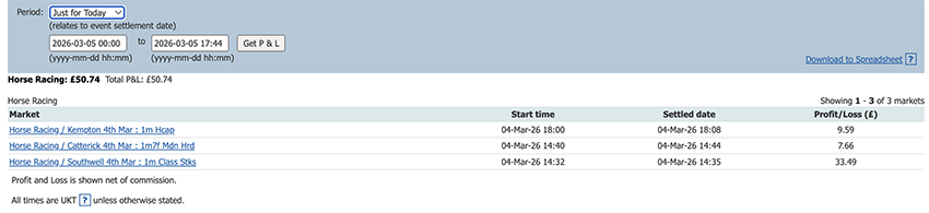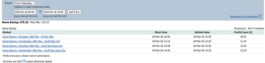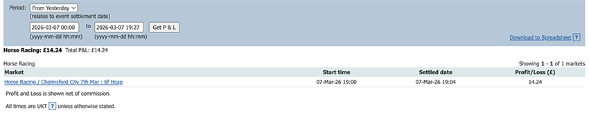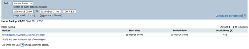 One bet one lay today and a small profit to add to the total.